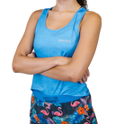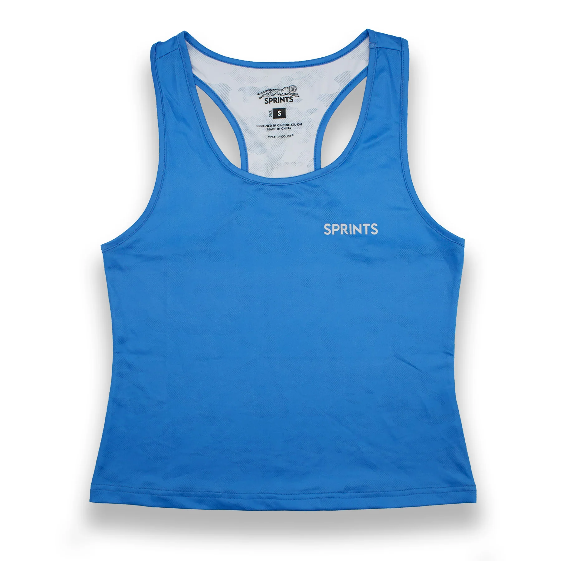 The Sprints Drenched Sky Tankie for women boasts a slim, flattering fit and is crafted from a durable, breathable blend of 92% polyester and 8% spandex. Its unique camo venting and four-way stretch make it the perfect addition to any active wardrobe.